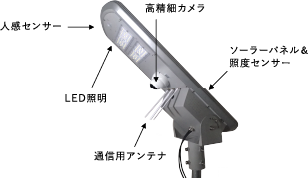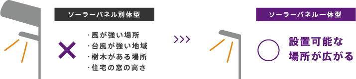 よくある従来のソーラー街路灯は、照明器具本体よりもずっと大きいソーラーパネルを要したため、ソーラーパネルは別体となっています。しかし、大きなパネルが邪魔になり、設置できない場所が多くありました。